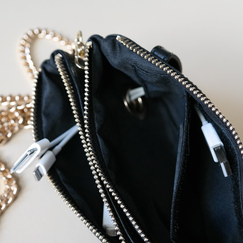 Die Tasche hat innen ein Tech-Highlight. In einem separaten Teil kann eine Powerbank verstaut werden und mit Hilfe der Kabel (3 verschieden Stecker) kann das Smartphone, iPod etc aufgeladen werden. ACHTUNG, funktioniert beim iPhone nur bis zum Modell 10.